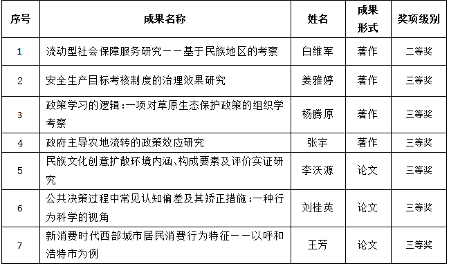 近日,第十一届内蒙古自治区哲学社会科学奖评选结果正式公布,内蒙古大学公共管理学院凭借卓越的科研实力,共荣获7项大奖,其中包括二等奖1项,三等奖6项,展现出公共管理学院在哲学社会科学研究领域的深厚积淀。在本届评选中,公共管理学院教师的研究成果获得了评审专家的高度认可。获奖成果涵盖公共治理、社会保障、政策研究、文化创新、生态保护等多个领域,聚焦自治区经济社会发展中的重要议题,体现了强烈的现实关怀和问题...