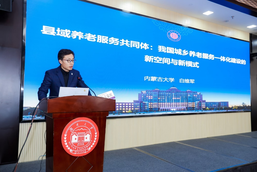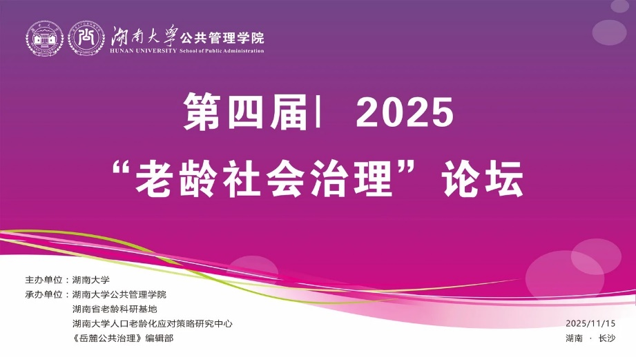 2025年11月15日,第四届“老龄社会治理”论坛在长沙举行。本次论坛由湖南大学主办,湖南大学公共管理学院、湖南省老龄科研基地、湖南大学人口老龄化应对策略研究中心及《岳麓公共治理》编辑部联合承办。论坛围绕老龄社会治理的前沿议题展开深度研讨与交流,并设“老龄社会治理与社会保障体系”“养老金融与银发经济”“养老服务与社会支持体系”“老龄健康与老年友好环境建设”及“老龄社会其他议题”五个分论坛。我院白维军院长应邀作主题报告演讲,博士研究生王邹恒瑞投稿参会并在第三分论坛作学术汇报。