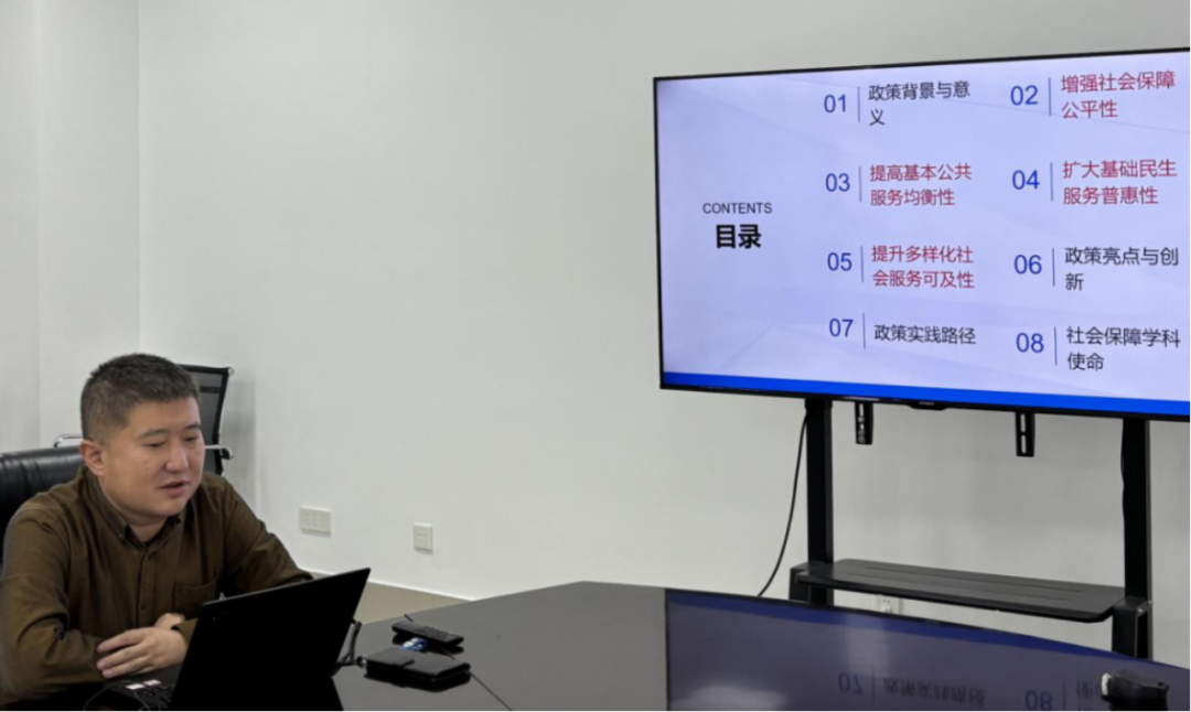 本次集体政策学习由社会保障科研团队负责人、副院长安华教授领学。安教授系统解读了政策的出台背景、核心要义与创新亮点,梳理了未来民生工作的实现路径,总结了社会保障未来的研究方向,并强调了社会保障学科在增进人民福祉进程中肩负的使命与担当。