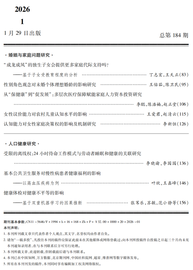 日前,我院苏敏教授团队在《人口与发展》2026年第1期发表题为《健康体检对健康不平等的影响——基于双重机器学习的因果推断》的最新研究成果。该研究由苏敏教授、博士研究生张苇乐、硕士研究生赵文菲以及西安交通大学公共政策与管理学院范小静副教授等合作完成。